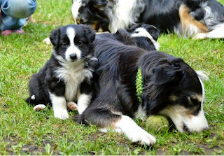 Pentujen lauantaihin mahtui useita vierailijoita. Aamulla kylään tulivat Linda sekä pitkämatkalaiset Marjo ja Anne. Kaikille kolmelle on muuttamassa oma K-poju. Aluksi pennut esittelivät raihallista puoltaan nukkuen pitkin olohuonetta. Päiväunien jälkeen lähdimme pihalle pupsien kanssa puuhaamaan. Pennut telmivät ja juoksivat pitkin pihaa. Nostin pari päivää sitten pihalle esiin suuren agilityputken. Pennut pitävät putken läpi juoksemisesta.